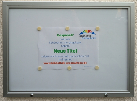 ... direkt an der Ecke zum Eingang, bestücken wir mit aktuellen Informationen für Sie. Dort können Sie sozusagen im Vorübergehen sehen, was demnächst in der Bibliothek gespielt - pardon! - geboten wird.